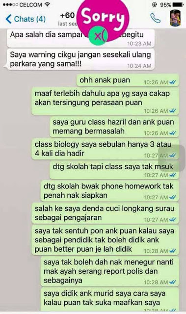 “Saya tak sentuh pun anak puan. Kalau saya sebagai pendidik tidak boleh mendidik anak puan, lebih baik puan sajalah yang mendidiknya. SAya tak boleh dah nak menegur, nanti mak dan ayahnya serang, lapor polis dan sebagainya. Saya didik murid saya mengikut cara saya. Kalau tak puan tak suka, maafkan saya,” jelasnya.