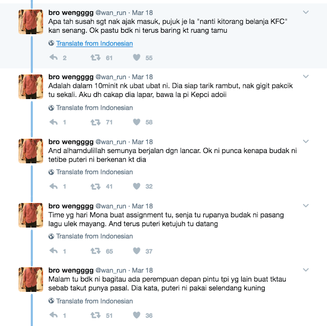 Pengguna Twitter, @wan_run, berkongsi kisah seorang wanita yang dirasuk oleh ‘puteri ulek mayang’ yang dikatakan dikongsi oleh seorang wanita, Mona, menerusi private message di Twitter.