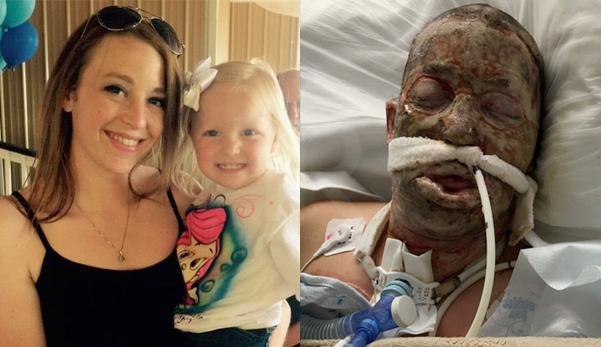 Courtney Cosper Waldon, 27, melecur tahap tiga di keseluruhan wajahnya dan 40 peratus pada tubuh badannya selepas gas yang dicurahkan ke unggun api meletup sebelum menyambar dirinya dalam kejadian September 2016.