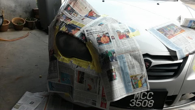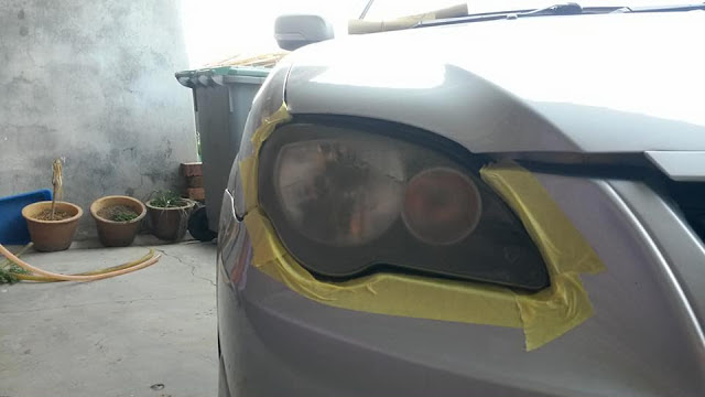 Selepas itu, tutup sekeliling lampu depan dengan surat khabar, proses seterusnya adalah untuk menyembur Clear Lacquer.