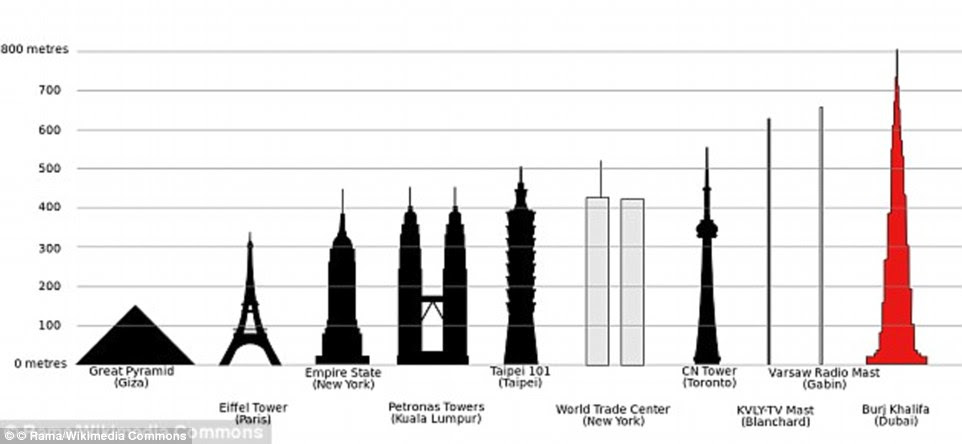 1    Burj Khalifa terletak pada ketinggian 828 meter (2,716.5 kaki). Ia adalah tiga kali lebih tinggi daripada Menara Eiffel dan hampir dua kali lebih tinggi daripada Empire State Building.