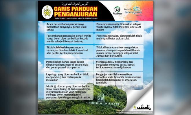 On Feb 18, Terengganu Tourism, Culture and Information Technology Committee chairperson Ariffin Deraman told journalists that an 11-point policy on arts, cultural and entertainment performances will soon be gazetted and will be enforced by the end of the year.