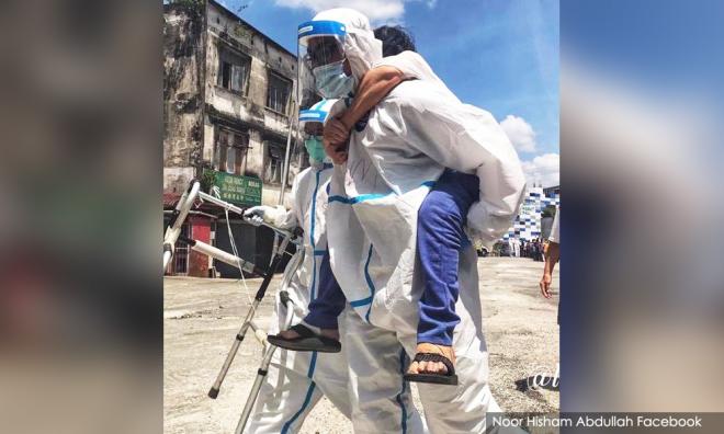 He attached the post with two images, the first showing one of a duo carrying the senior citizen while the other held a walker, and the second image showed four frontliners in full PPE suit, with the words "We Love Malaysia, Stay Safe" written on their gloves.